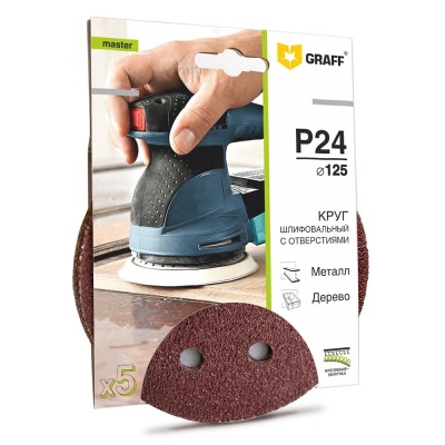 Шлифлист круг 5 шт. 125 мм Р24 8 отверстий GRAFF - крупнозернистый и предназначен для очень грубых работ.