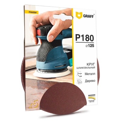 Шлифлист круг 5 шт. 125 мм Р180 GRAFF -крупнозернистый и предназначен для окончательной шлифовки.