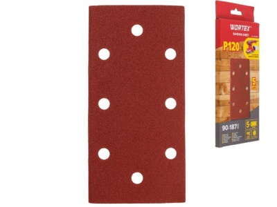 Шлифлист 90х187мм Р120 для дерева. 8 отверстий (5 шт), WORTEX 1334434