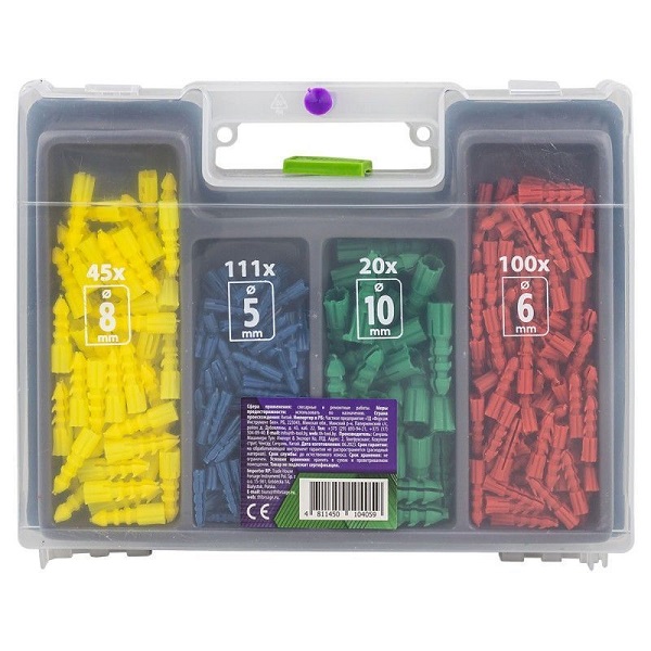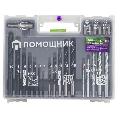 Набор бит и сверл с расходниками в пластиковом кейсе (300 предметов), Помощник 423090 - это универсальный набор для сверления отверстий различного диаметра в разнообразных материалах. Сверла изготовлены их высококачественной инструментальной стали и имеют высокую прочность и износостойкость. В комплекте 17 сверл, 6 бит, битодержатель, а также четыре типоразмера дюбелей. Битодержатель имеет удобную форму и легко фиксируется на головке шуруповерта или дрели. Все биты и сверла изготовлены из высококачественных материалов, что делает их надежными, прочными и устойчивыми к коррозии.