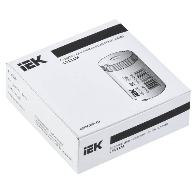 Стартер LS111M 4-65 Вт 220-240 В IEK LLD111-LS-65 для быстрого и надежного зажигания трубчатых люминесцентных ламп, работающих в сети переменного тока частотой 50 Гц. Стартер представляет собой миниатюрную газоразрядную лампу с тлеющим разрядом, которая состоит из колбы, заполненной инертным газом, и двух электродов, размещенных внутри этой колбы. Имеет влагостойкий высоковольтный конденсатор для сглаживания радиопомех и импульсов пускового напряжения.