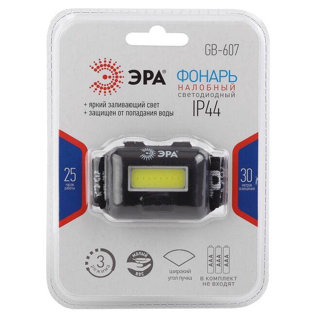 Фонарь налобный GB-607 ЭРА 100033201 – минималистичный налобный LED-фонарь, который можно использовать даже во время дождя. Работает в трёх режимах - высокая яркость, низкая яркость, мигание. Корпус имеет международный индекс защиты от влаги и пыли IP44. Фонарь светит мощным заливающим светом благодаря LED-плате со светодиодами последнего поколения. Это сверхлёгкое устройство (весит всего 60 гр!) очень удобно использовать - простое управление режимами и мягкий эластичный ремешок с регулировкой размера. Отлично подходит для рыбалки, охоты, строительных и ремонтных работ в тёмных помещениях, поездок на велосипеде, загородных прогулок и путешествий в регионы с любым климатом. Дальность светового луча - 30 метров. От трёх мизинчиковых (3 х ААА) батареек непрерывно работает 25 часов.