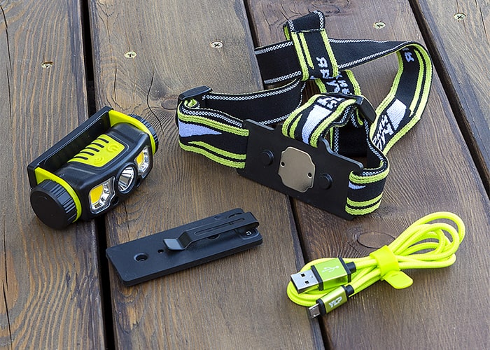 Комплект: фонарь, аккумулятор, наголовное крепление, крепление с клипсой, шнур USB.