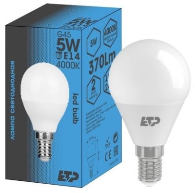 Лампа светодиодная G45 5W E14 4000K ETP. Светодиодные лампы торгового знака «ETP» предназначены для освещения всех типов помещений, где соблюдены эксплуатационные требования по температуре и влажности. Могут применяться в светильниках всех типов, подходящих по размеру и цоколю.