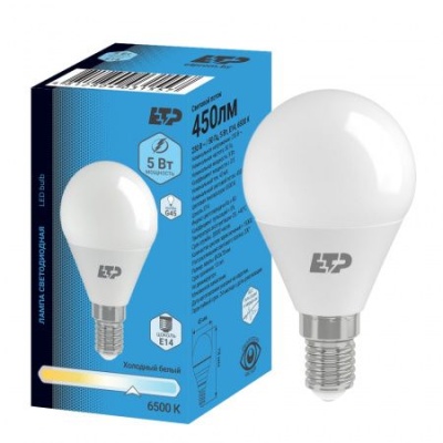 Лампа светодиодная G45 5W E14 6500K ETP. Светодиодные лампы торгового знака «ETP» предназначены для освещения всех типов помещений, где соблюдены эксплуатационные требования по температуре и влажности. Могут применяться в светильниках всех типов, подходящих по размеру и цоколю.