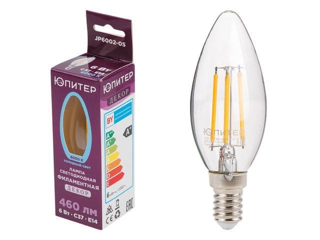 Лампа светодиодная филаментная C37 JP6002-05 6Вт E14 4000K ЮПИТЕР ДЕКОР