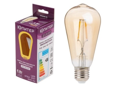 Лампа светодиодная филаментная ST64 JP6006-01 6Вт E27 3000K ЮПИТЕР ДЕКОР в ретро стиле предназначена для использования с любыми светильниками соответствующей мощности и цоколем. Теплый белый свет для создания комфортных условий.