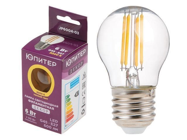 Лампа светодиодная филаментная G45 JP6004-03 6Вт E27 3000K ЮПИТЕР ДЕКОР в форме шара предназначена для использования с любыми светильниками соответствующей мощности и цоколем. Теплый белый свет для создания комфортных условий.