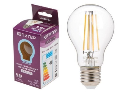 Лампа светодиодная филаментная А60 СТАНДАРТ JP6001-04 8Вт E27 4000K ЮПИТЕР ДЕКОР