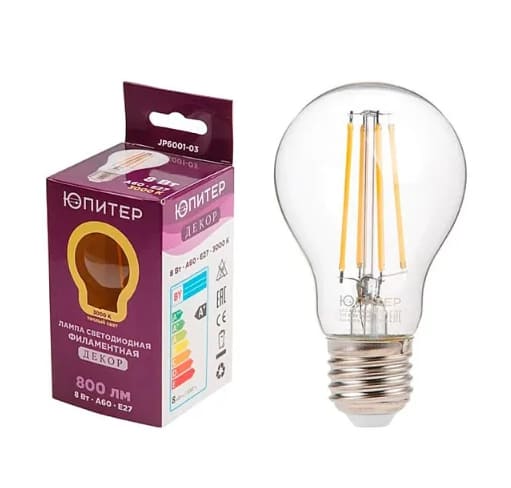 Лампа светодиодная филаментная А60 СТАНДАРТ JP6001-03 8Вт E27 3000K ЮПИТЕР ДЕКОР
