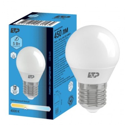 Лампа светодиодная G45 5W E27 6500K ETP. Светодиодные лампы торгового знака «ETP» предназначены для освещения всех типов помещений, где соблюдены эксплуатационные требования по температуре и влажности. Могут применяться в светильниках всех типов, подходящих по размеру и цоколю.