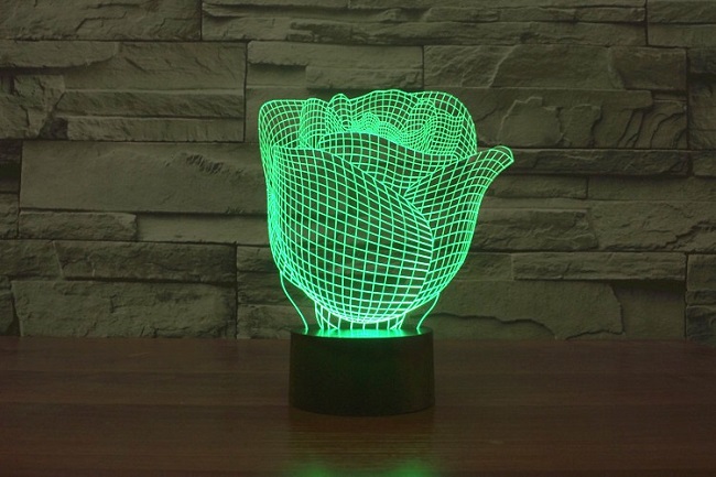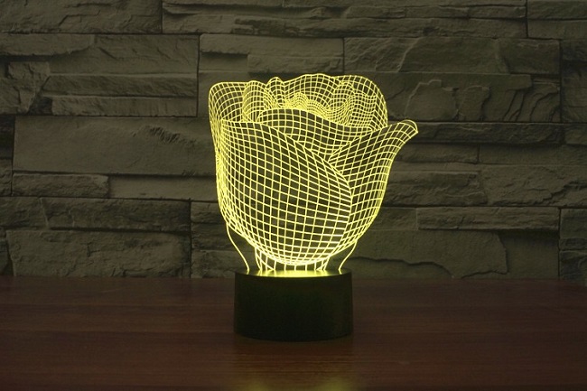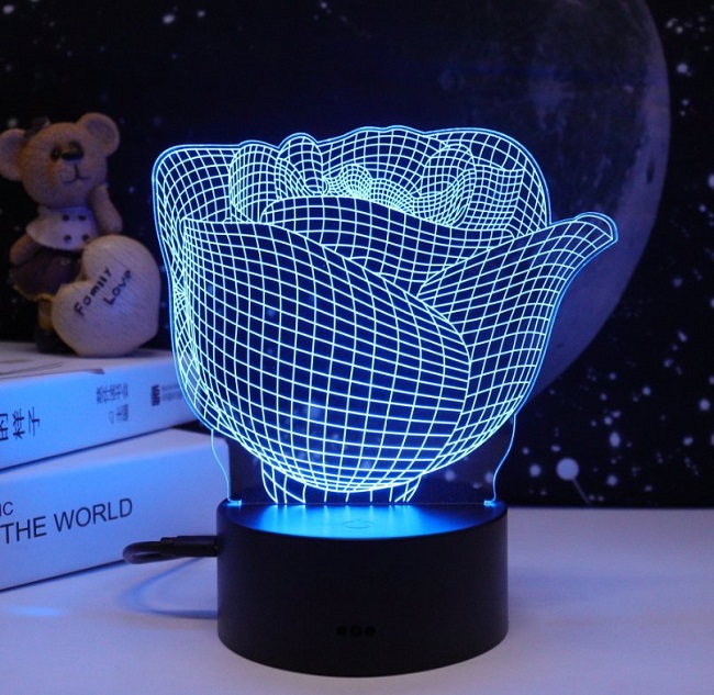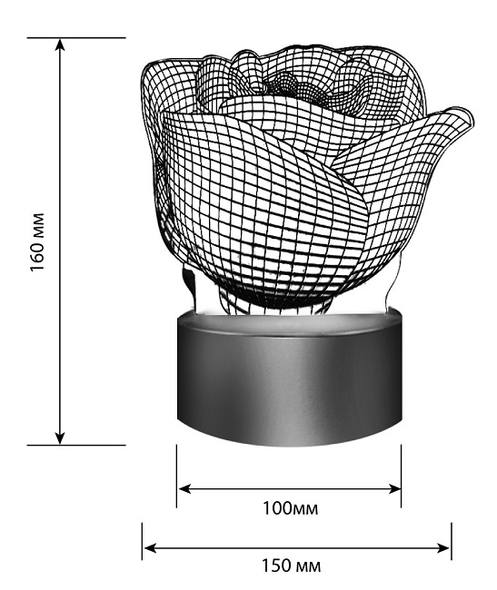 - Особенности: Питание от сети 220В, питание от батареек 3 АА (в комплект не входят), питание от USB-порта. Эффект объёмного изображения, RGB подсветка 7 цветов