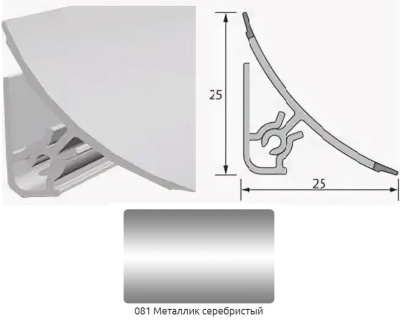 Плинтус для столешницы 3м Металлик серебристый/081 Идеал – сконструирован для декорирования стыков поверхностей стены и столешницы. Плотное прилегание мягкой кромки плинтуса к стене и столешнице обеспечивает защиту от влаги и грязи. Может применяться и в ванных комнатах, так как устойчив к повышенной влажности и перепадам температур. Состоит из заднего монтажного профиля и лицевой части.