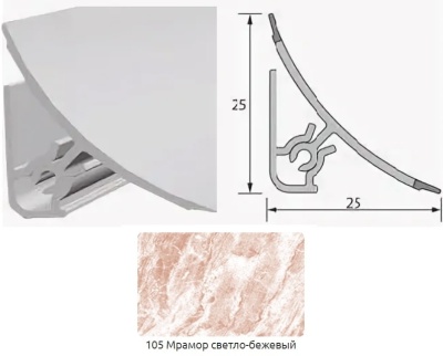 Плинтус для столешницы 3м Мрамор светло-бежевый/105 Идеал – сконструирован для декорирования стыков поверхностей стены и столешницы. Плотное прилегание мягкой кромки плинтуса к стене и столешнице обеспечивает защиту от влаги и грязи. Может применяться и в ванных комнатах, так как устойчив к повышенной влажности и перепадам температур. Состоит из заднего монтажного профиля и лицевой части.
