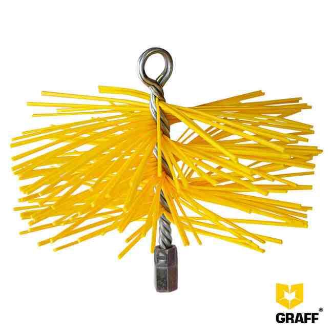 Щетка нейлоновая круглая M12 для чистки дымоxода GRAFF для прочистки дымохода из нержавеющей стали круглой формы. Синтетические щетинки бережно очищают трубы, не повреждая металлической поверхности . Закрепляется щетка на гибкий стержень и имеет кольцо для фиксации дополнительного груза.