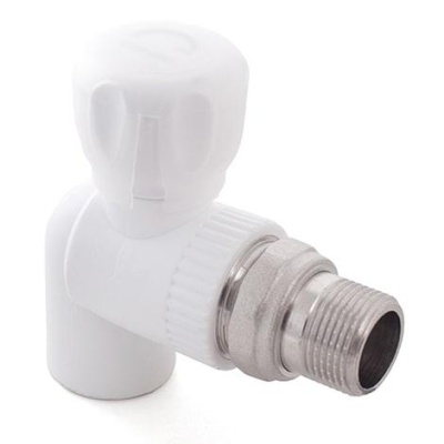 Кран полипропиленовый шаровый угловой, 20x1/2", белый, РосТурПласт применяется для подключения радиаторов к разводке из полипропиленовых труб. Позволяет перекрывать поток теплоносителя через отопительный прибор. Подключение крана к радиатору производится с помощью латунного никелированного полусгона, закрепленного на закладной детали накидной гайкой.