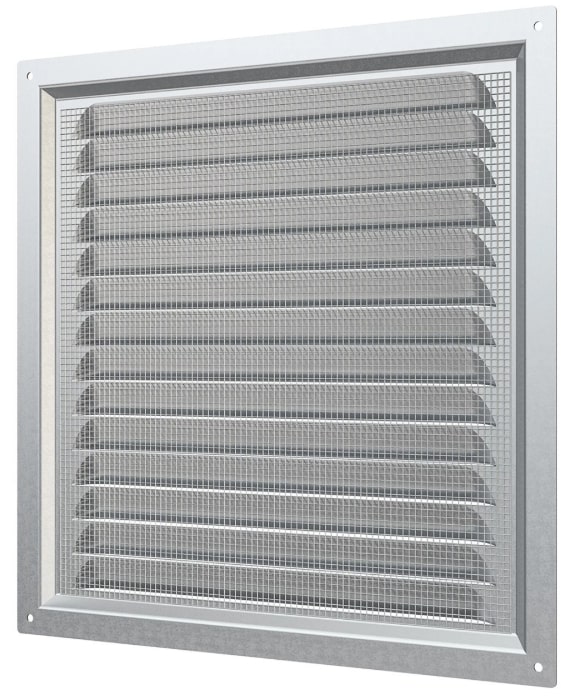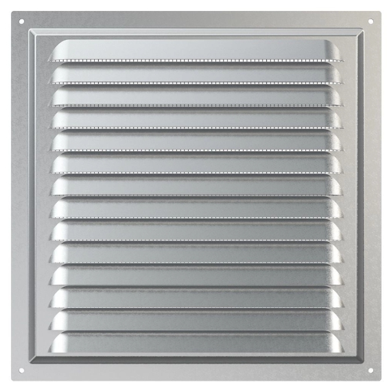 Решетка вентиляционная металлическая с оцинкованным покрытием 250х250 мм ERA. Имеет наклонные жалюзи и антимоскитную сетку для защиты от насекомых. Сетка устанавливается в специальном углублении.