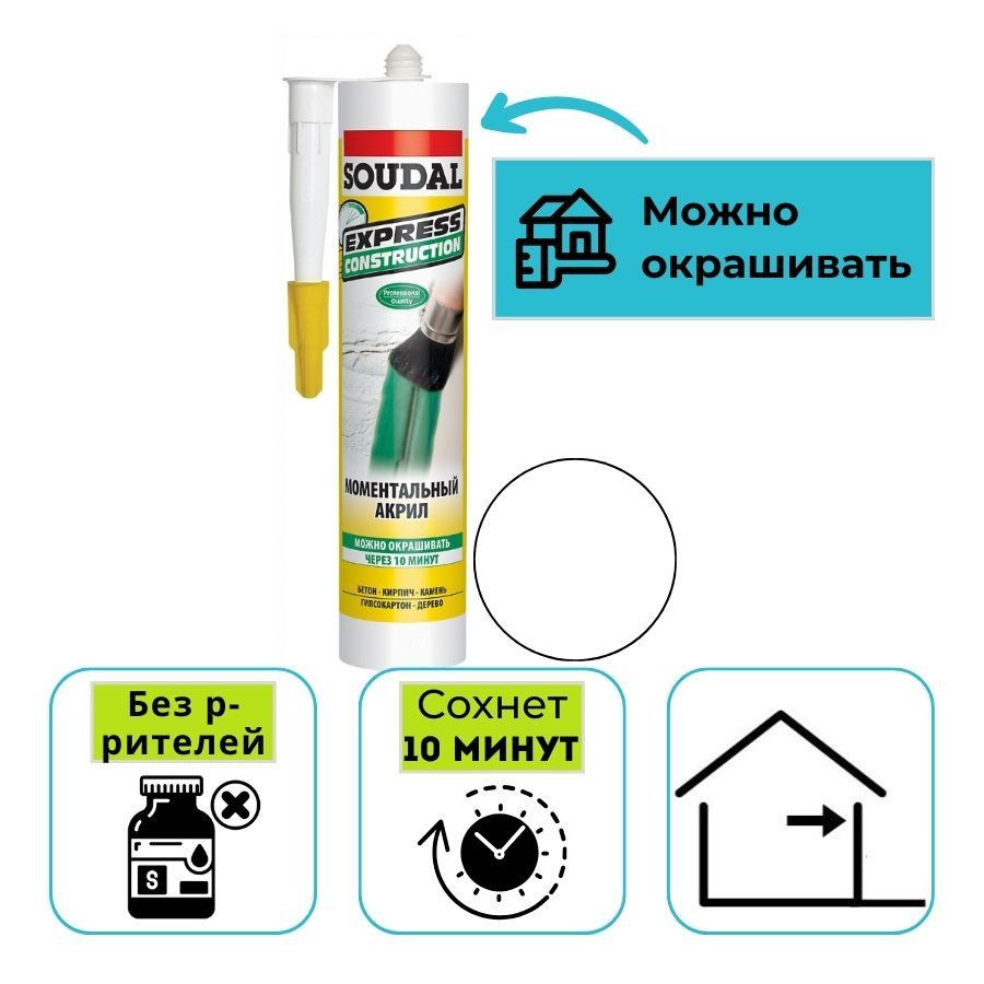 Герметик акриловый моментальный Soudal EXPRESS CONSTRUCTION бел 280мл это инновационный однокомпонентный акриловый герметик, который можно обрабатывать и красить уже через 10 минут после нанесения. Благодаря превосходной адгезии к типичным пористым поверхностям – кирпичу, бетону, дереву, камню, гипсокартону – незаменимый при всяких отделочных работах внутри помещений. Подходит для применения внутри помещений.