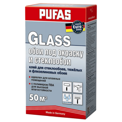 Клей обойный "PUFAS GLASS для стеклообоев, тяжелых и флизелиновых EURO 3000", (50 м2), 500 г используется для работ по оклейке особо тяжелыми материалами, такими как: обои на основе стекловолокна, флизелина, текстиля или обои под окраску. Подходит для помещений с повышенной влажностью. Быстрорастворим. Готовая клеевая масса не содержит сгустков, однородна, прозрачна при высыхании.