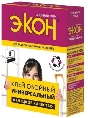 Клей обойный Универсальный 200г ЭКОН предназначен для наклеивания всех видов бумажных обоев: гладких, структурных, гофрированных, дуплекс, тяжелых
