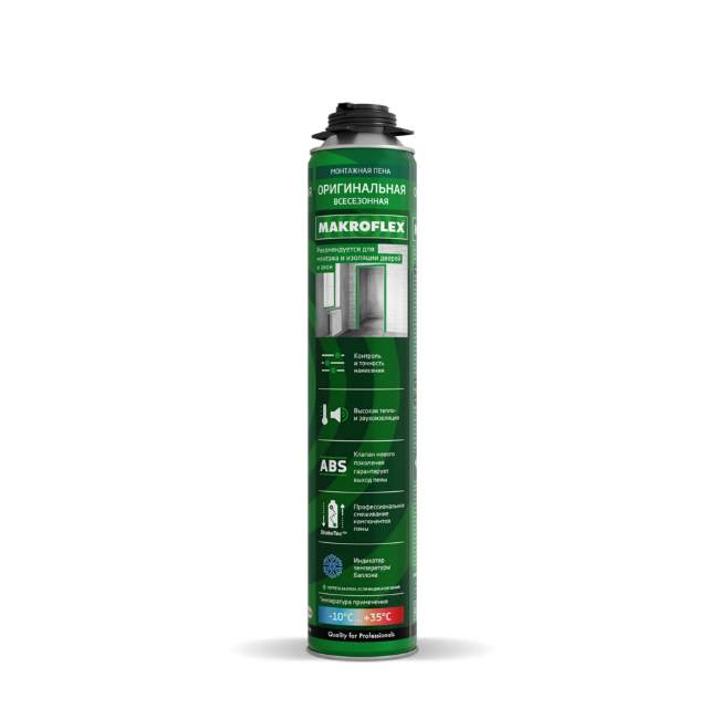 Пена монтажная полиуретановая MAKROFLEX Original PRO AS всесезонная 750 мл - однокомпонентная, отверждаемая за счет реакции с влагой воздуха, полиуретановая пена с превосходным соотношением открытых-закрытых ячеек и высокой механической прочностью. Наносится при помощи специального монтажного пистолета. Температура окружающей среды при нанесении от -10°С до +35°С.