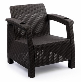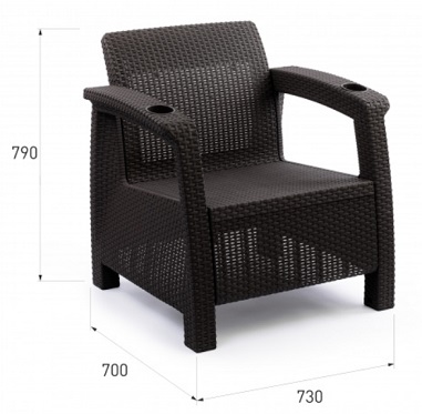 Кресло произведено из высококачественного полипропилена, имитирующего плетение из ротанга. Кресло имеет одно посадочное место, допустимая нагрузка на одно посадочное место - 106 кг . На подлокотниках расположены отверстия для напитков. Кресло может стать идеальным решением по оформлению зоны отдыха в доме, на садовом участке, в офисном помещении или в кафе. Благодаря цветовым решениям, кресло подойдет под любой интерьер.