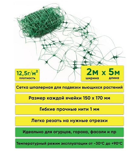 Основная задача сетки - выращивание однолетних культур (огурцы, горох, фасоль, кабачки) Применение: растянуть над грядкой, закрепив нижний край сетки. Растянуть сетку вертикально, закрепить верхний край.