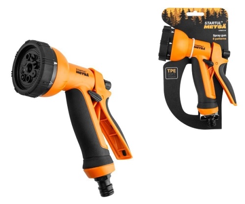Пистолет-распылитель 8-позиционный STARTUL METSA (ST6013-01) для полива на дачных участках, в садах, парках и скверах. Противоскользящее покрытие из термопластичного эластомера (TPE) обладает повышенной износостойкостью, мягкостью и устойчивостью к воздействию внешней среды. Фиксирующий курок для длительного полива.