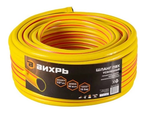 Шланг поливочный трёхслойный армированный Вихрь предназначен для подачи воды на дачных участках. ПВХ хорошо держит форму, не перекручивается. Шланг армирован синтетической нитью, держит давление 18 бар, диаметр 1/2 дюйма, длина шланга 25 метров.