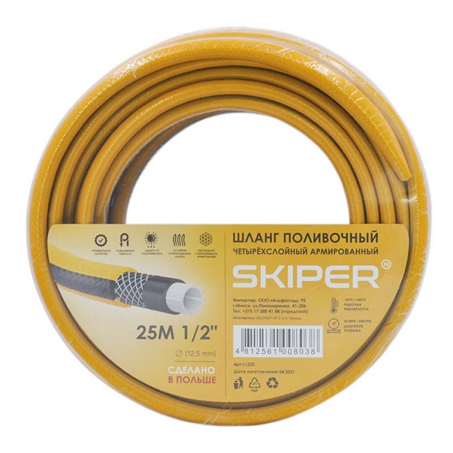 Шланг поливочный 4-х слойный 1/2" 25м, SKIPER L1225 - армированный четырехслойный поливочный шланг применяется для полива растений на садово-огородных участках.