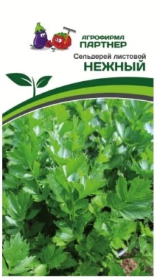 Сельдерей листовой НЕЖНЫЙ 0,3г Агрофирма Партнер. Сорт среднеранний, листовой. От всходов до технической спелости 100-105 дней. Розетка листьев полувертикальная, высотой и шириной до 40 см, с многочисленными отклоненными боковыми побегами. Лист тёмно-зелёный, средне глянцевый, с высокой ароматичностью. После первой срезки идет активное нарастание новых листьев, что значительно увеличивает урожайность. Всходы переносят заморозки до минус 3-5°C. Сорт требователен к плодородию почвы и регулярным, умеренным поливам. Рекомендуется для использования в свежем, сушёном и замороженном виде. Плотность посадки не более 10 растений/м2. Урожайность зелени около 3,5 кг/м2.