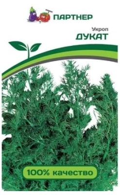 Укроп ДУКАТ 2г Агрофирма Партнер. Сорт среднеспелый. От всходов до уборки на зелень 40-50 дней, на специи - 90-100 дней. Растение компактное, хорошо облиственное. Стебель зелёный, утолщенный с восковым налётом. Листья крупные, зелёные со слабым восковым налетом. Конечные сегменты листа длинные. Центральный зонтик плоский, среднего диаметра. Масса одного растения на зелень 20-25 г, на специи 65 г. Ароматичность хорошая. Сорт устойчив к полеганию, к корневой и прикорневой гнилям. Плотность посадки 150-170 растений/м2. Урожайность на зелень 2,5-3 кг/м2, на специи - до 5 кг/м2.