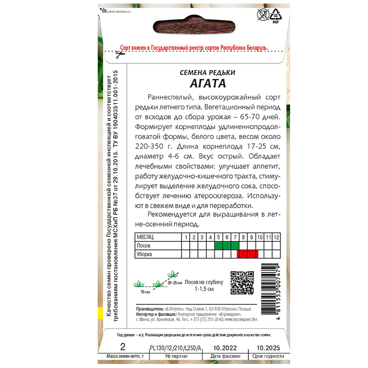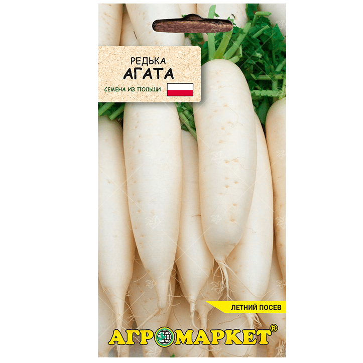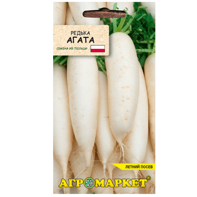 Редька Агата, 2г Агромаркет. Раннеспелый, высокоурожайный сорт редьки летнего типа. Вегетационный период от всходов до сбора урожая — 65-70 дней. Формирует корнеплоды удлиненнопродолговатой формы, белого цвета, весом около 220-350 г. Длина корнеплода 17-25 см. диаметр 4-6 см. Вкус острый. Обладает лечебными свойствами: улучшает аппетит, работу желудочно-кишечного тракта, стимулирует выделение желудочного сока, способствует лечению атеросклероза. Используют в свежем виде и для переработки. Рекомендуется для выращивания в летнеосенний период.
