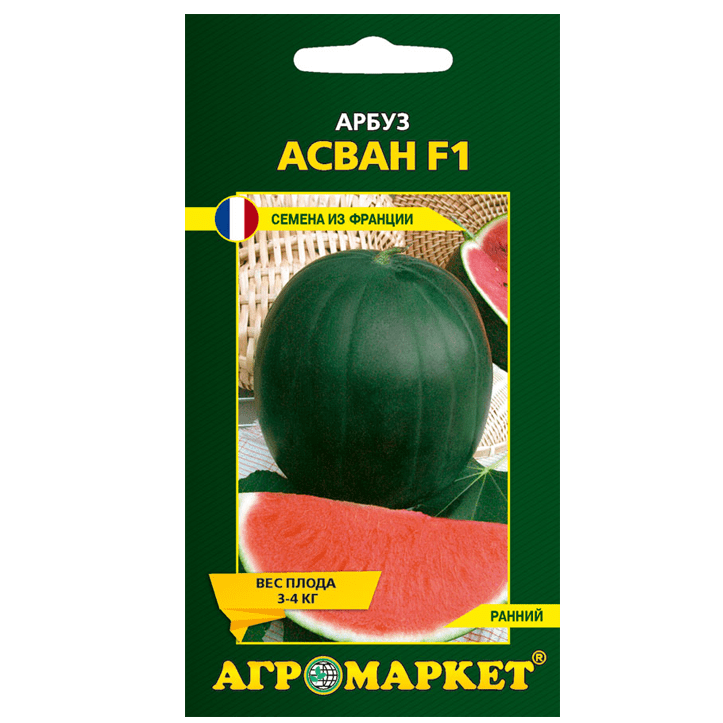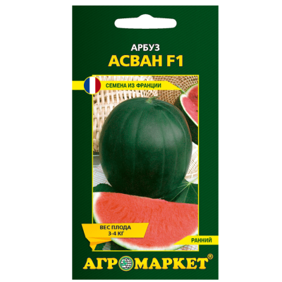 Арбуз Асван F1, 5 шт Агромаркет. Ранний гибрид (сбор урожая на 60-70 день после высадки рассады). Растение мощное. Плоды округлые, темно-зеленого цвета, весом 3-4 кг. В условиях Беларуси рекомендуется для выращивания в пленочных теплицах.