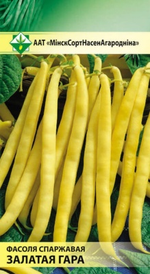 Фасоль Золотая гора спаржевая 7г МинскСортСемОвощ. Среднеранний сорт. Период от всходов до технической спелости . Растение кустовое, высотой около 40 см. Стручки золотисто-желтые, слегка изогнутые, почти округлые в поперечном разрезе, длиной 11-13 см, без жесткого пергаментного слоя и волокна. Вкусовые и диетические качества высокие. В пищу используются молодые стручки и вызревшие семена после термической обработки. Идеален для замораживания.