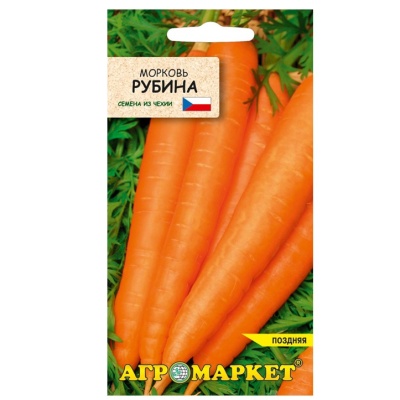 Морковь Рубина, 1г Агромаркет. Поздний сорт (от всходов до урожая-145 дней). Моковь образует красно-оранжевые сочные корнеплоды типа Берликум. длиной 18-22 см. Рекомендуется для выращивания в открытом грунте. Для потребления в свежем виде, переработки и продолжительного хранения. Морковь — относительно холодостойкое растение. Семена ее начинают прорастать при температуре 3-4°С, а всходы выдерживают заморозки до -4°С. Семена мелкие, прорастают медленно, всходы появляются на 14-16-й день, растут и развиваются сначала очень медленно. Свежий навоз под перекопку не применяют, так как от него снижается качество корнеплодов (появляются корнеплоды уродливой формы, уменьшается содержание сухого вещества) и их лежкость. В загущенных местах проводят прореживание всходов, оставляя растение от растения на расстоянии 1 — 2 см. Второе прореживание проводят, когда у моркови образуется 4-5 листьев, а диаметр корнеплодов достигнет 0,5-1,0 см. Морковь 3 раза за сезон подкармливают минеральными удобрениями серии «Лифдрип».