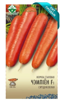 Морковь Чемпион F1 столовая, 0,3г (Эксперт) МинскСортСемОвощ. Среднеспелый высокоурожайный гибрид голландской селекции. Корнеплоды цилиндрической формы, выровненные по форме, тупоконечные, с гладкой поверхностью, длинной 23-25 см, устойчивы к растрескиванию. Мякоть ярко-оранжевая, с небольшой сердцевиной. Отличается высоким содержанием каротина. Дегустационная оценка свежей продукции 5,0 баллов, консервированной - 4,9 балла. Универсального назначения, рекомендуется для хранения.