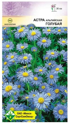 Астра альпийская Голубая 0.1г МинскСортСемОвощ. Продолжительно и обильноцветущее многолетнее растение высотой до 30 см. Цветки яркие, лавандово-голубые с золотистой серединкой, крупные - 4-5 см в диаметре. Незаменима в групповых посадках, для бордюров и альпийских горок. Выращивают посевом семян непосредственно в грунт в конце апреля - мае или делением куста осенью или весной. Достаточно холодостойкая. Зимует без укрытия. Предпочитает солнечное место, но может расти и в полутени.