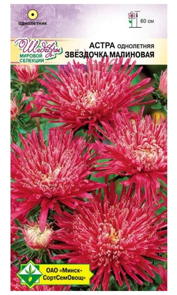 Астра Звездочка Малиновая 0.1г МинскСортСемОвощ. Новейший изящный срезочный сорт. Куст раскидистый, высотой около 60 см. Соцветия махровые, малинового цвета, в диаметре 10-12 см, уникальные по форме. Крайние лепестки соцветий длинные и узкие, а с середины до центра короткие ажурные. На пике цветения растения похожи на звездные россыпи. Великолепно подходит для срезки и клумб. Отличается длительным и обильным цветением. Устойчива к неблагоприятным погодным условиям.