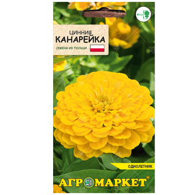 Цинния Канарейка, 1 г Агромаркет. Немногие летники выглядят столь же привлекательно как цинния. Ее мощный, раскидистый куст и крупные махровые цветы, диаметром до 15 см, придают всему растению очень декоративный вид. Срезанные цветы долго стоят в воде. Используют для посадки в пестрые цветники, на клумбы, рабатки и для срезки.
