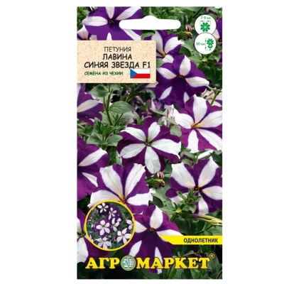 Петуния гибридная Лавина Синяя звезда F1 7шт Агромаркет. Новая группа гибридных ампельных петуний. Молодые растения прямостоящие. Побеги, вырастая, свешиваются и образуют настоящую лавину из крупных цветков ярко-синего цвета с белой звездой посередине. Очень эффектны в балконных ящиках, подвесных корзинах и т.д. Хорошо растут на солнечных местах. Необходимы регулярные подкормки минеральными комплексными удобрениями, с повышенным содержанием калия. Цветки диаметром 7-9 см. Цветут до заморозков.