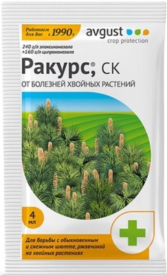 Фунгицид Ракурс 4мл avgust - (лекарство для борьбы с грибковыми заболеваниями хвойных растений) Ракурс на основе эпоксиконазола и ципроконазола (240 г/л + 160 г/л, суспензионный концентрат) эффективно борется с такими напастями как: шютте (снежное, обыкновенное) и ржавчина.