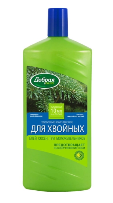 Жидкое органо-минеральное удобрение Добрая сила для хвойных содержит полный комплекс веществ, необходимых для полноценного и сбалансированного питания растений, способствует хорошему росту растений. Подходит для елей, сосен, кипарисов, тиса, кедра, можжевельника, туи, пихты, лиственницы и других хвойных растений.