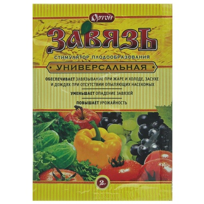 Стимулятор плодообразования Завязь универсальная 2г Ортон предназначен для применения на овощных и плодово-ягодных культурах. Улучшает завязывание плодов, предотвращает опадение завязей, ускоряет рост и созревание плодов, улучшает их качество, повышает урожайность на 15-30%. Эффективен при неблагоприятных для завязывания условиях. Класс опасности 3 (умеренно опасные вещества).