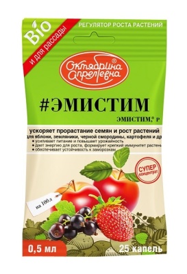 Регулятор роста растений ЭМИСТИМ 0.5мл Октябрина Апрелевна ускоряет прорастание семян и рост растений. Применяется для яблони, земляники, черной смородины, картофеля и др. Уникальный регулятор роста растений широкого спектра действия с очень экономичной дозой применения. Продукт биотехнологического выращивания грибов-эпифитов из корневой системы лекарственных растений. Содержит сбалансированный комплекс (фитогормонов, аминокислот, углеводов, жирных кислот, микроэлементов).
