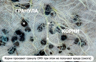 - ОМУ - удобрение пролонгированного действия и до начала его «работы» стимуляцией развития корней занимаются гуминовые вещества, нанесенные на поверхность гранул. Попадая в почву, удобрение отдает в окружающую среду гумат, способствуя прорастанию семян и развитию корневых волосков. А когда корневая система достаточно развита, она поглощает питание из ОМУ и окружающей почвенной среды.
