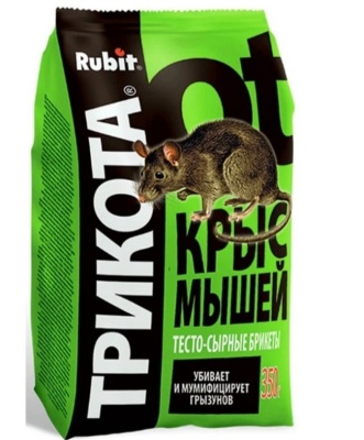 Брикеты от крыс и мышей тесто-сырные "Трикота" 350 гр Рубит. Новый эффективный родентицидный препарат с мумифицирующим эффектом. Высокая привлекательность средства достигнута благодаря комплексу натуральных компонентов, лакомых для крыс и мышей. В состав приманки входит действующее вещество последнего поколения, что гарантирует уничтожения грызунов-вредителей даже при однократном ее поедании. Вызывает удушье грызунов, их гибель наступает, как правило, на открытых местах, а не в норах. Высокоэффективное средство борьбы с мышевидными грызунами - достаточно однократного поедания. Обладает высокой привлекающей способностью для крыс и мышей. Активно даже в отношении грызунов, не чувствительных к другим ядам. Вызывает удушье мышей и крыс - гибель наступает, как правило, на открытых местах, а не в норах. Приманка не вызывает отпугивающего действия и настороженности других особей, т.к. гибель грызунов происходит через 3-6 суток после поедания брикетов.