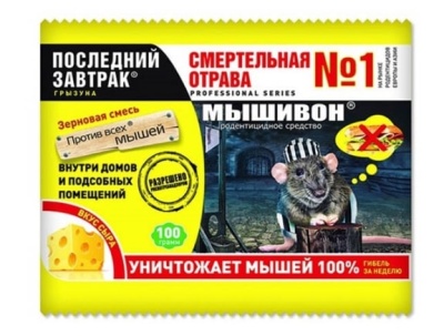 Зерновая приманка от грызунов Мышивон 100 гр. Используется для уничтожения домовой мыши, внутри помещения и прилегающей к нему территории. Препарат готов к применению и не требует дополнительного смешивания с приманочным материалом. Зерно прошло декортикацию, не плесневеет при длительном хранении. Действующее вещество: Bromadiolone 0,005%, Denatonium Benzoate 0,001%.