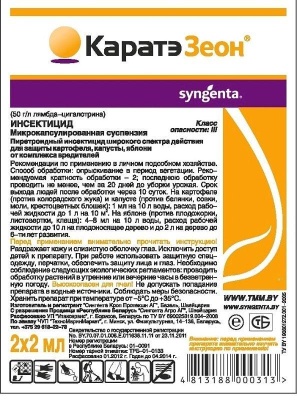 Технология применения: применяйте КАРАТЭ®ЗЕОН в максимальной норме расхода при высокой численности вредителей и при работе против имаго и личинок старших возрастов. Норма расхода рабочей жидкости должна быть достаточной для обеспечения покрытия всей листовой поверхности культуры, но не допускайте стекания препарата с обработанной поверхности.