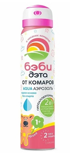Аэрозоль Бэби Дэта "Аква" специально разработан для бережной и щадящей защиты детей с 1 года при нанесении на открытые части тела, одежду, детскую коляску и другие изделия из ткани. Эффективно защищает от укусов комаров, москитов и мокрецов в течение двух часов. Благодаря рецептуре на водной основе аэрозоль не сушит кожу, а входящий в состав алоэ вера ухаживает за ней, смягчая и увлажняя.
